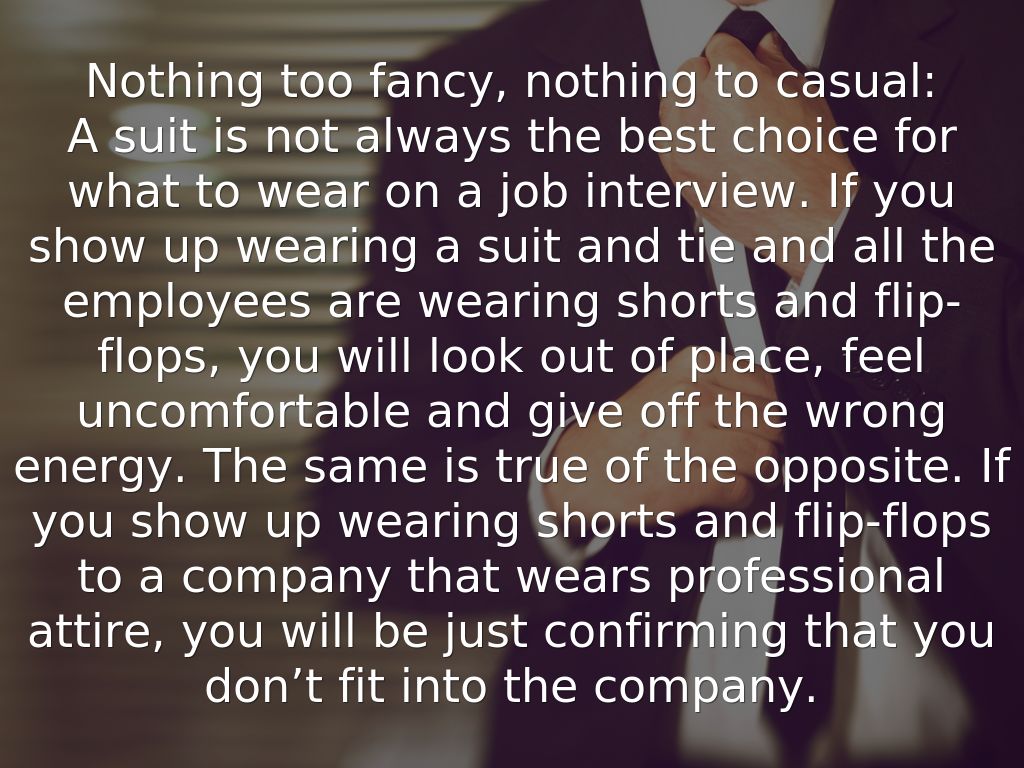 Nothing too fancy, nothing to casual: A suit is not always the best choice for what to wear on a job interview. If you show up wearing a suit and tie and all the employees are wearing shorts and flip-flops, you will look out of place, feel uncomfortable and give off the wrong energy. The same is true of the opposite. If you show up wearing shorts and flip-flops to a company that wears professional attire, you will be just confirming that you don’t fit into the company.