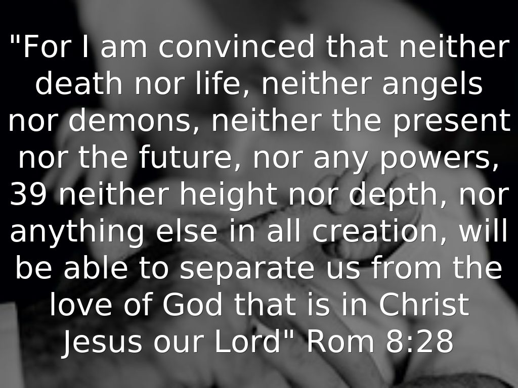 "For I am convinced that neither death nor life, neither angels nor demons, neither the present nor the future, nor any powers, 39 neither height nor depth, nor anything else in all creation, will be able to separate us from the love of God that is in Christ Jesus our Lord" Rom 8:28