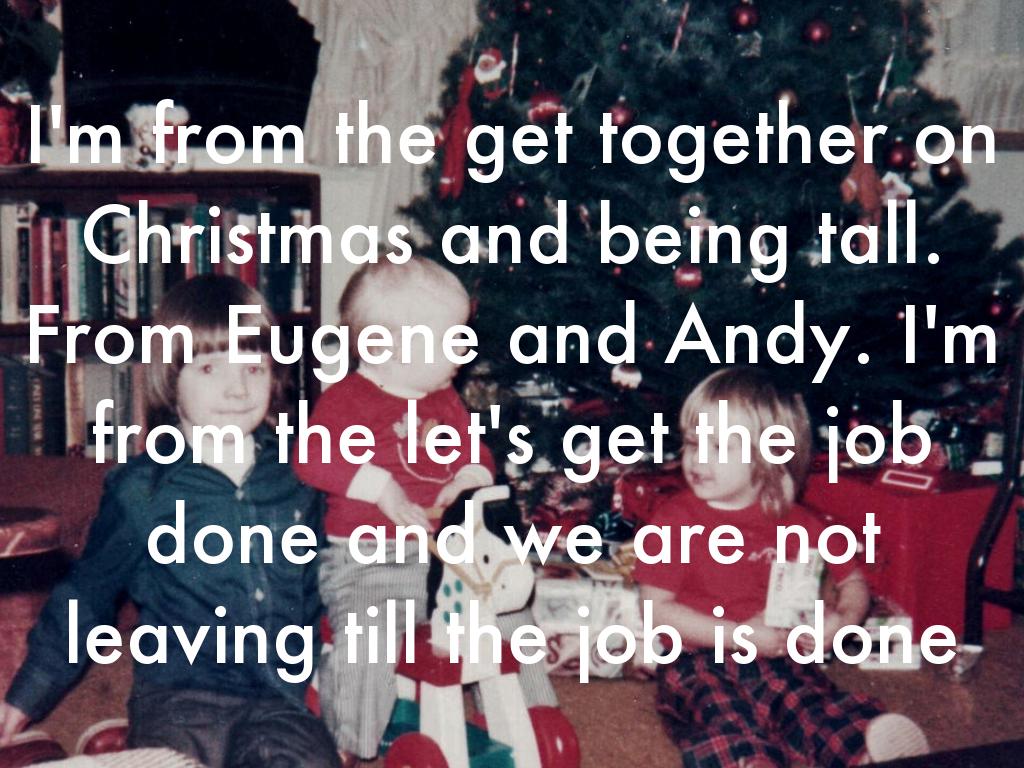 I'm from the get together on Christmas and being tall. From Eugene and Andy. I'm from the let's get the job done and we are not leaving till the job is done