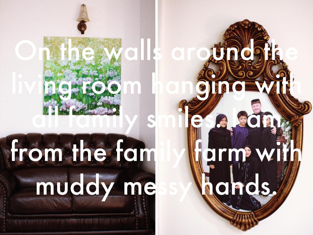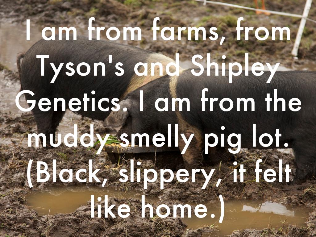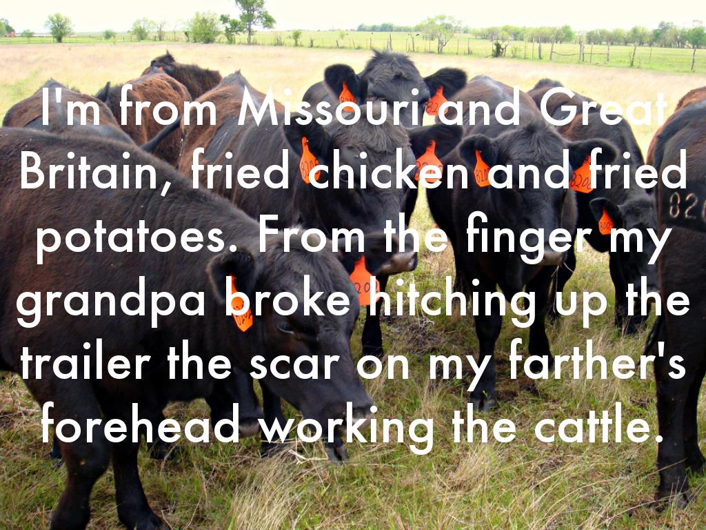 I'm from Missouri and Great Britain, fried chicken and fried potatoes. From the finger my grandpa broke hitching up the trailer the scar on my farther's forehead working the cattle.