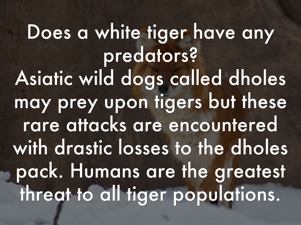 Asiatic wild dogs called dholes may prey upon tigers but these rare attacks are encountered with drastic losses to the dholes pack. Humans are the greatest threat to all tiger populations.