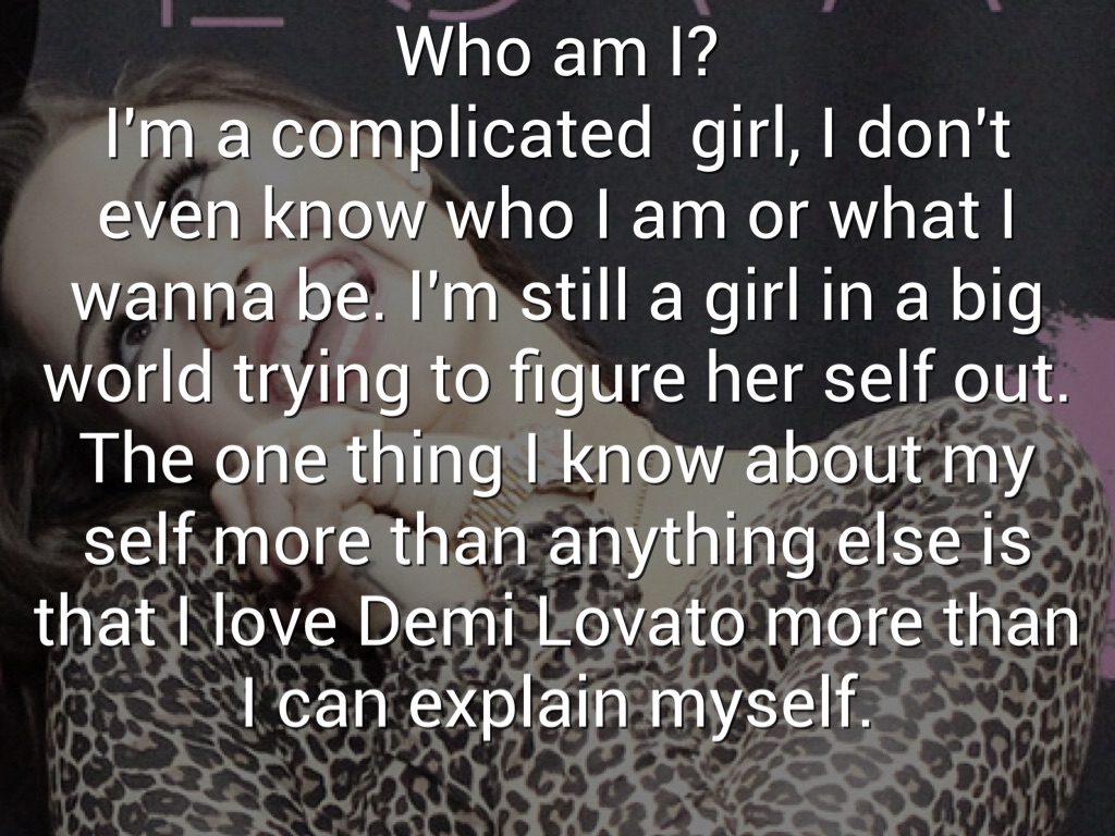 I'm a complicated girl, I don't even know who I am or what I wanna be. I'm still a girl in a big world trying to figure her self out. The one thing I know about my self more than anything else is that I love Demi Lovato more than I can explain myself.