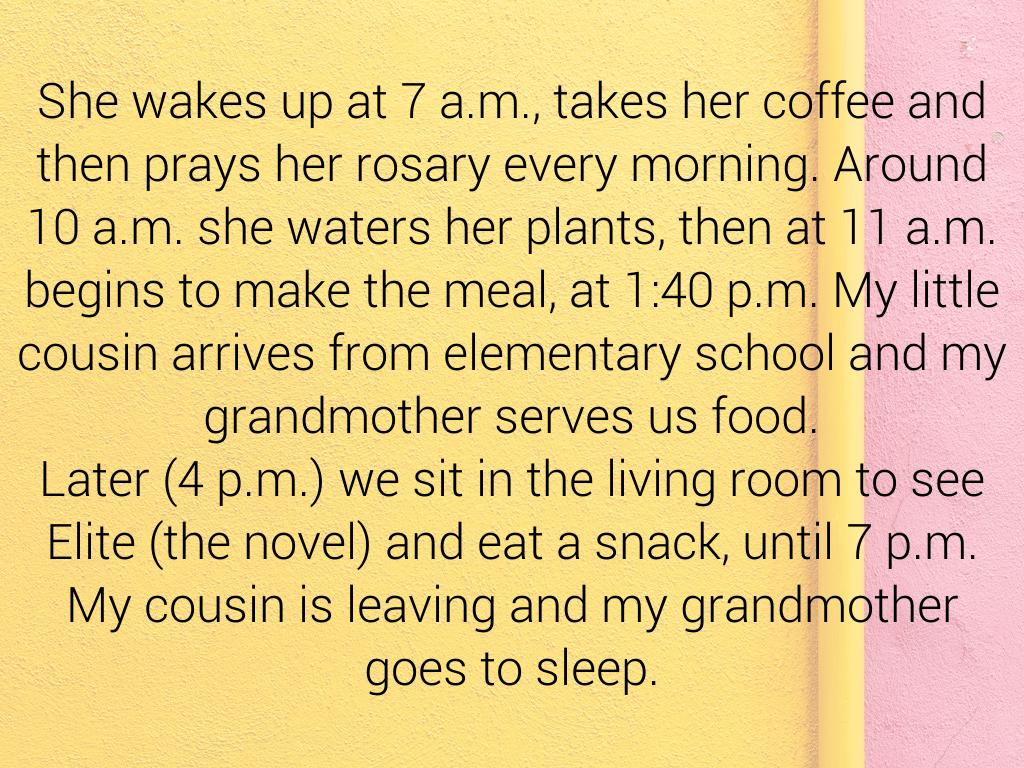 She wakes up at 7 a.m., takes her coffee and then prays her rosary every morning. Around 10 a.m. she waters her plants, then at 11 a.m. begins to make the meal, at 1:40 p.m. My little cousin arrives from elementary school and my grandmother serves us food. Later (4 p.m.) we sit in the living room to see Elite (the novel) and eat a snack, until 7 p.m. My cousin is leaving and my grandmother goes to sleep.