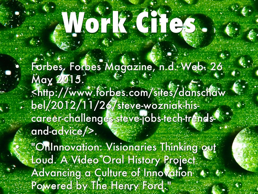"OnInnovation: Visionaries Thinking out Loud. A Video Oral History Project Advancing a Culture of Innovation Powered by The Henry Ford." OnInnovation: Did You Take Inspiration from Any Great Inventors? with Steve Wozniak. N.p., n.d. Web. 26 May 2015. .