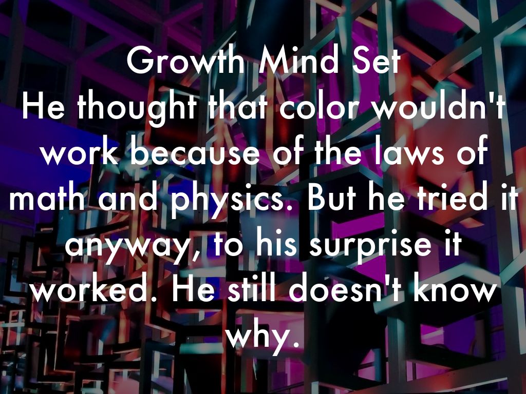 Growth Mind Set He thought that color wouldn't work because of the laws of math and physics. But he tried it anyway, to his surprise it worked. He still doesn't know why.