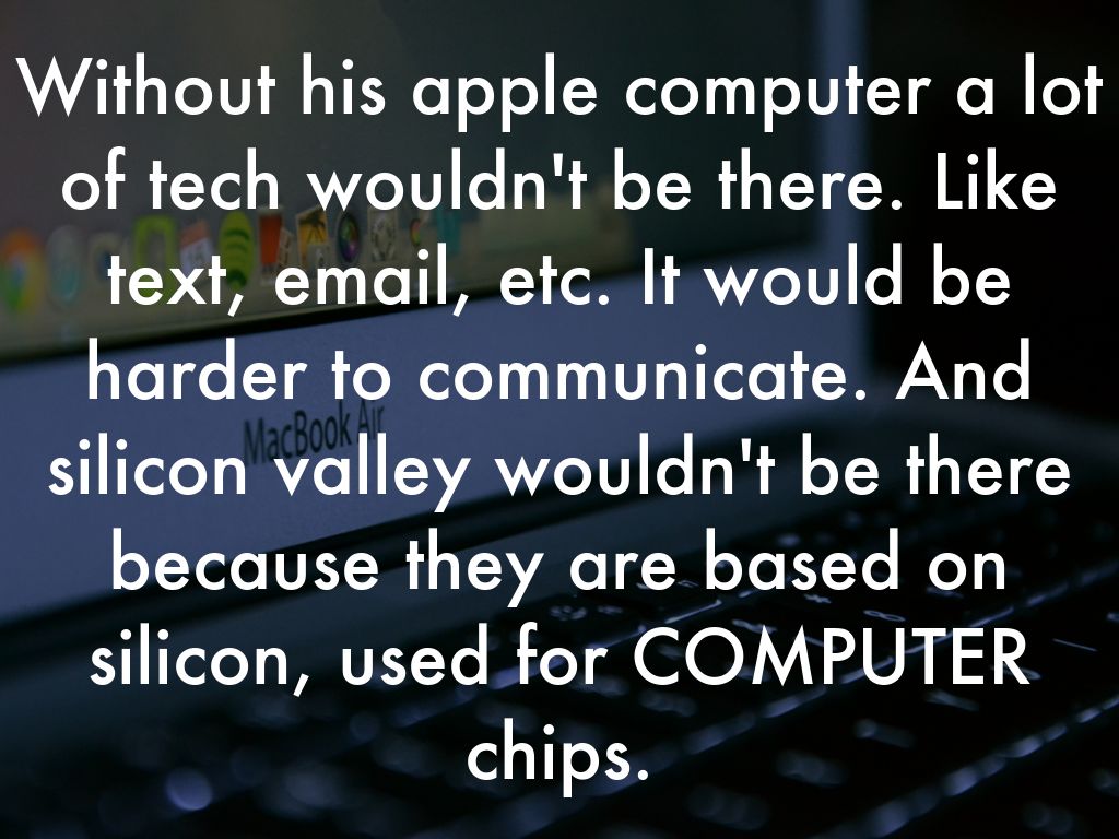Without his apple computer a lot of tech wouldn't be there. Like text, email, etc. It would be harder to communicate. And silicon valley wouldn't be there because they are based on silicon, used for COMPUTER chips.