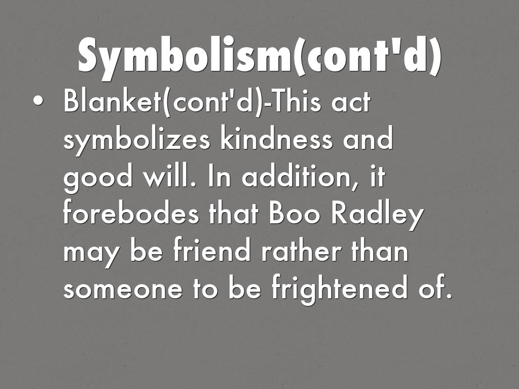 Blanket(cont'd)-This act symbolizes kindness and good will. In addition, it forebodes that Boo Radley may be friend rather than someone to be frightened of.