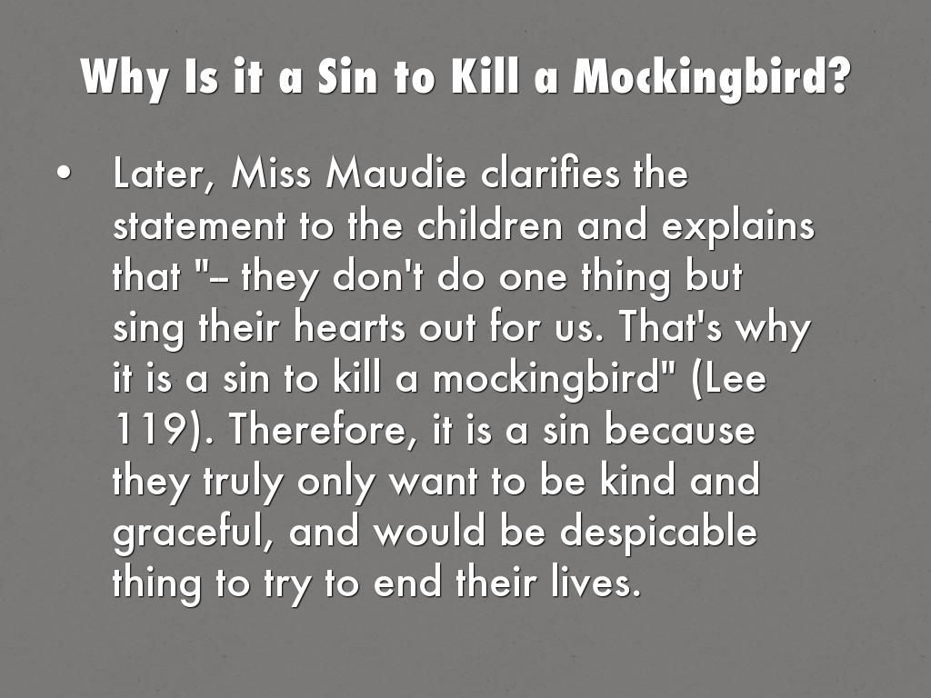 Later, Miss Maudie clarifies the statement to the children and explains that "-- they don't do one thing but sing their hearts out for us. That's why it is a sin to kill a mockingbird" (Lee 119). Therefore, it is a sin because they truly only want to be kind and graceful, and would be despicable thing to try to end their lives.