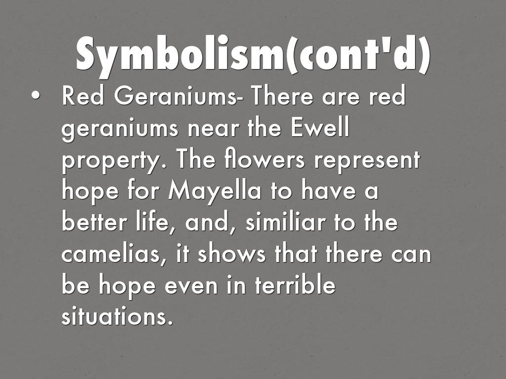 Red Geraniums- There are red geraniums near the Ewell property. The flowers represent hope for Mayella to have a better life, and, similiar to the camelias, it shows that there can be hope even in terrible situations.