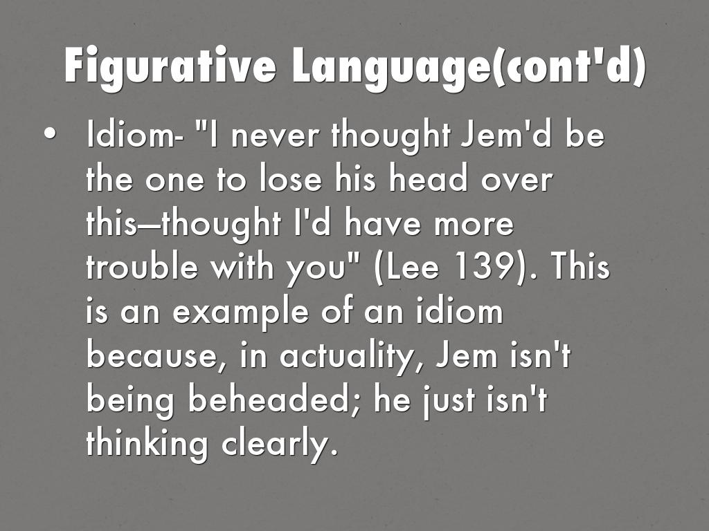 Idiom- "I never thought Jem'd be the one to lose his head over this---thought I'd have more trouble with you" (Lee 139). This is an example of an idiom because, in actuality, Jem isn't being beheaded; he just isn't thinking clearly.