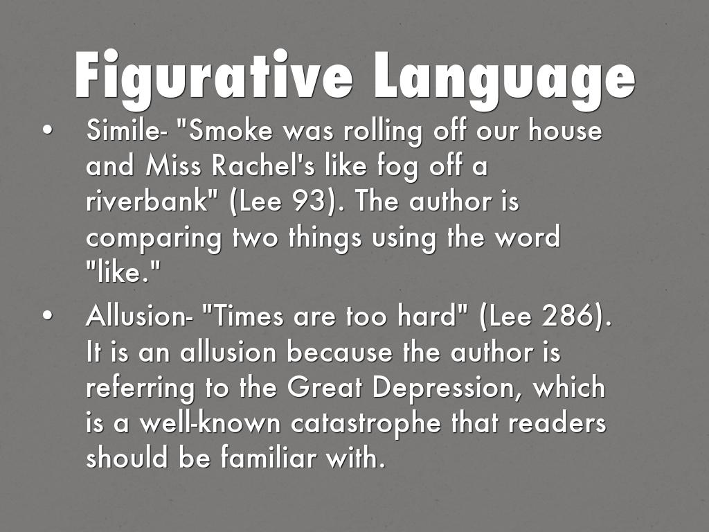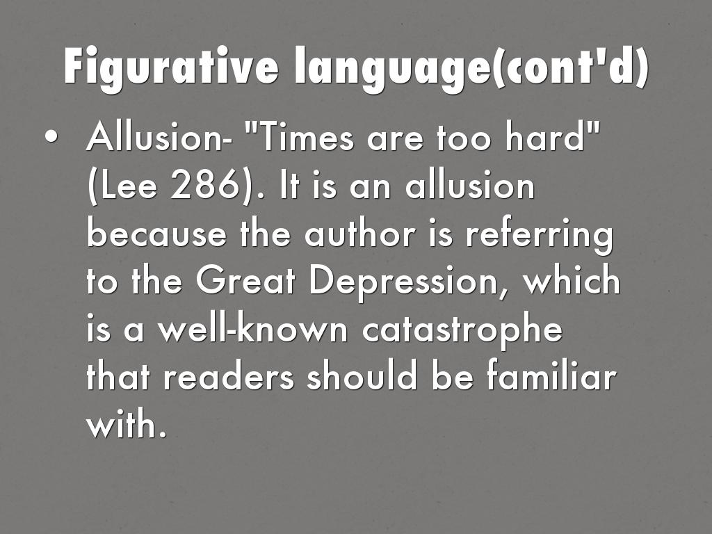 Allusion- "Times are too hard" (Lee 286). It is an allusion because the author is referring to the Great Depression, which is a well-known catastrophe that readers should be familiar with.