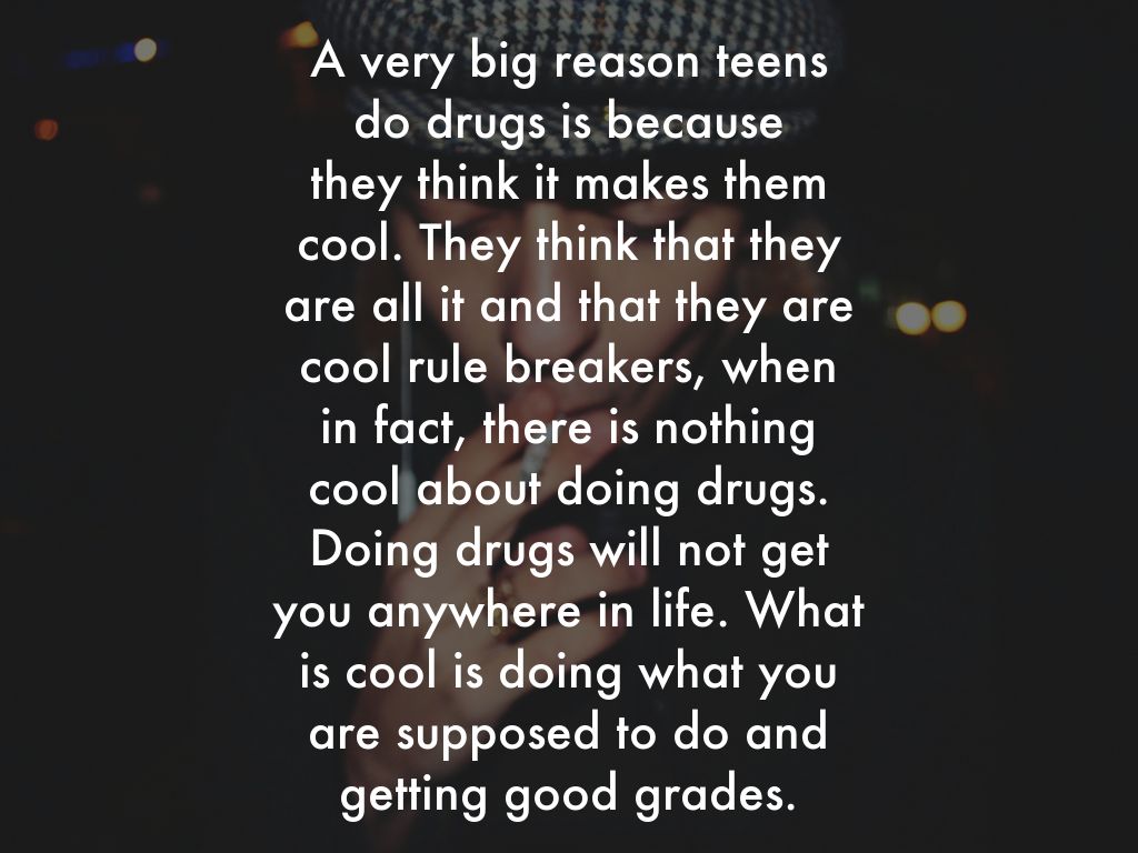 A very big reason teens do drugs is because they think it makes them cool. They think that they are all it and that they are cool rule breakers, when in fact, there is nothing cool about doing drugs. Doing drugs will not get you anywhere in life. What is cool is doing what you are supposed to do and getting good grades.