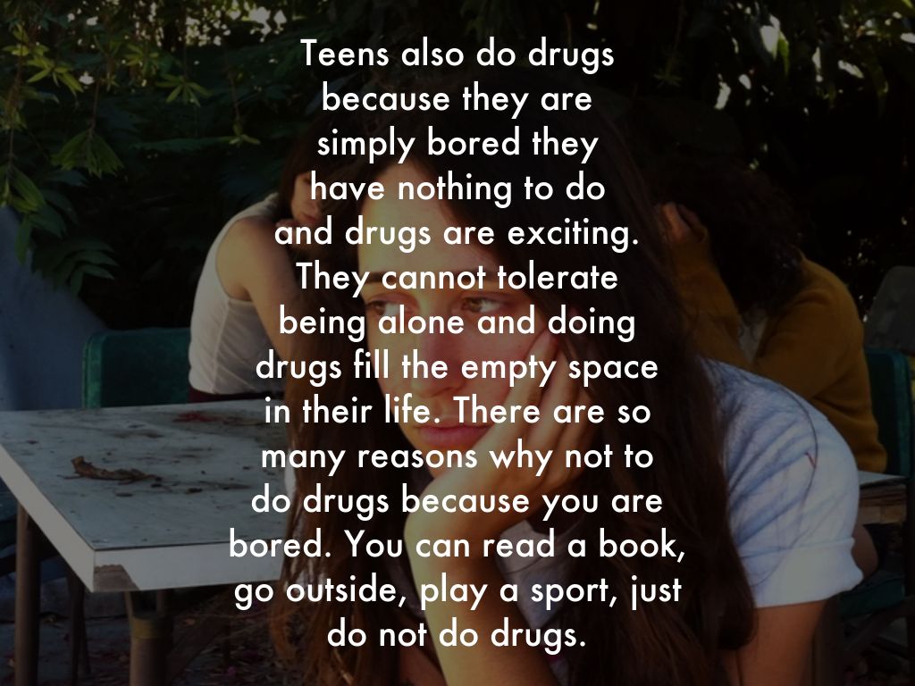 Teens also do drugs because they are simply bored they have nothing to do and drugs are exciting. They cannot tolerate being alone and doing drugs fill the empty space in their life. There are so many reasons why not to do drugs because you are bored. You can read a book, go outside, play a sport, just do not do drugs.