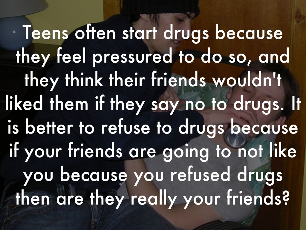 Teens often start drugs because they feel pressured to do so, and they think their friends wouldn't liked them if they say no to drugs. It is better to refuse to drugs because if your friends are going to not like you because you refused drugs then are they really your friends?