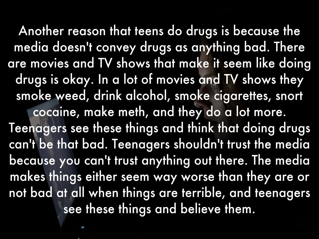 Another reason that teens do drugs is because the media doesn't convey drugs as anything bad. There are movies and TV shows that make it seem like doing drugs is okay. In a lot of movies and TV shows they smoke weed, drink alcohol, smoke cigarettes, snort cocaine, make meth, and they do a lot more. Teenagers see these things and think that doing drugs can't be that bad. Teenagers shouldn't trust the media because you can't trust anything out there. The media makes things either seem way worse than they are or not bad at all when things are terrible, and teenagers see these things and believe them.