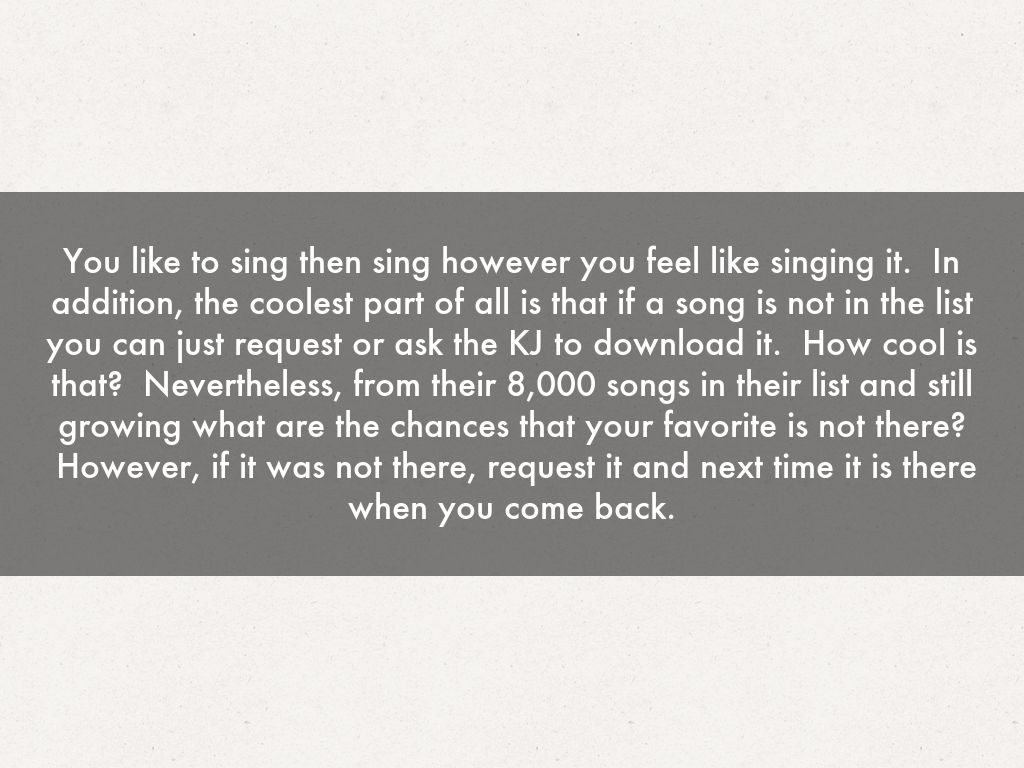 You like to sing then sing however you feel like singing it. In addition, the coolest part of all is that if a song is not in the list you can just request or ask the KJ to download it. How cool is that? Nevertheless, from their 8,000 songs in their list and still growing what are the chances that your favorite is not there? However, if it was not there, request it and next time it is there when you come back.