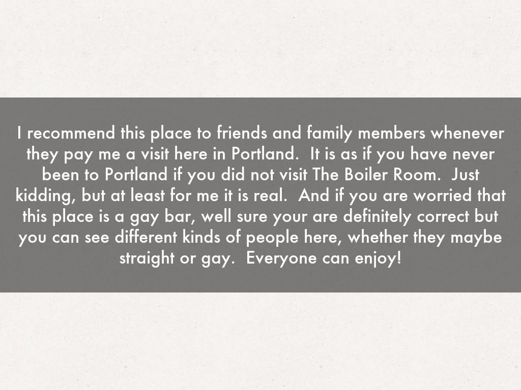I recommend this place to friends and family members whenever they pay me a visit here in Portland. It is as if you have never been to Portland if you did not visit The Boiler Room. Just kidding, but at least for me it is real. And if you are worried that this place is a gay bar, well sure your are definitely correct but you can see different kinds of people here, whether they maybe straight or gay. Everyone can enjoy!