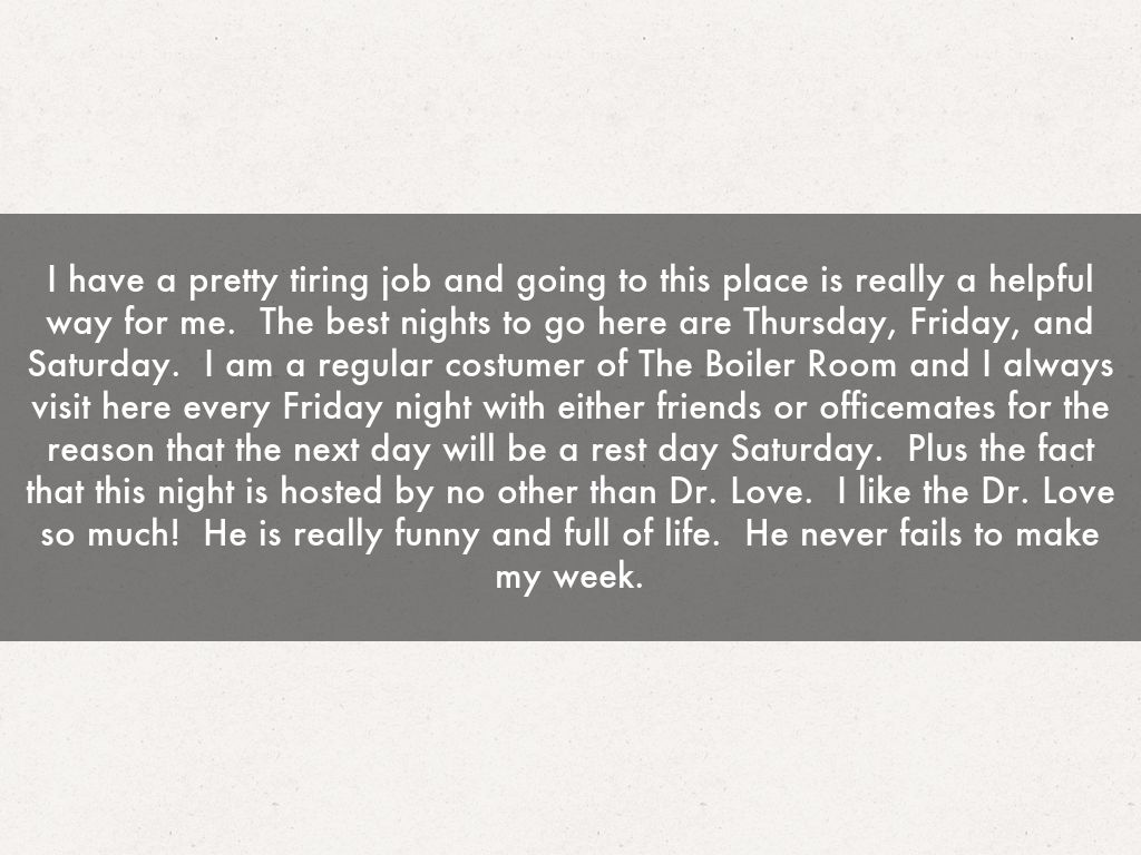 I have a pretty tiring job and going to this place is really a helpful way for me. The best nights to go here are Thursday, Friday, and Saturday. I am a regular costumer of The Boiler Room and I always visit here every Friday night with either friends or officemates for the reason that the next day will be a rest day Saturday. Plus the fact that this night is hosted by no other than Dr. Love. I like the Dr. Love so much! He is really funny and full of life. He never fails to make my week.