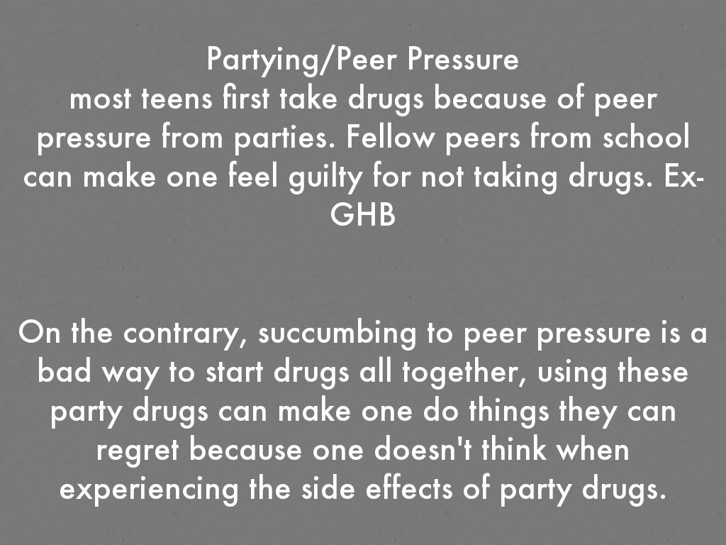 most teens first take drugs because of peer pressure from parties. Fellow peers from school can make one feel guilty for not taking drugs. Ex- GHB