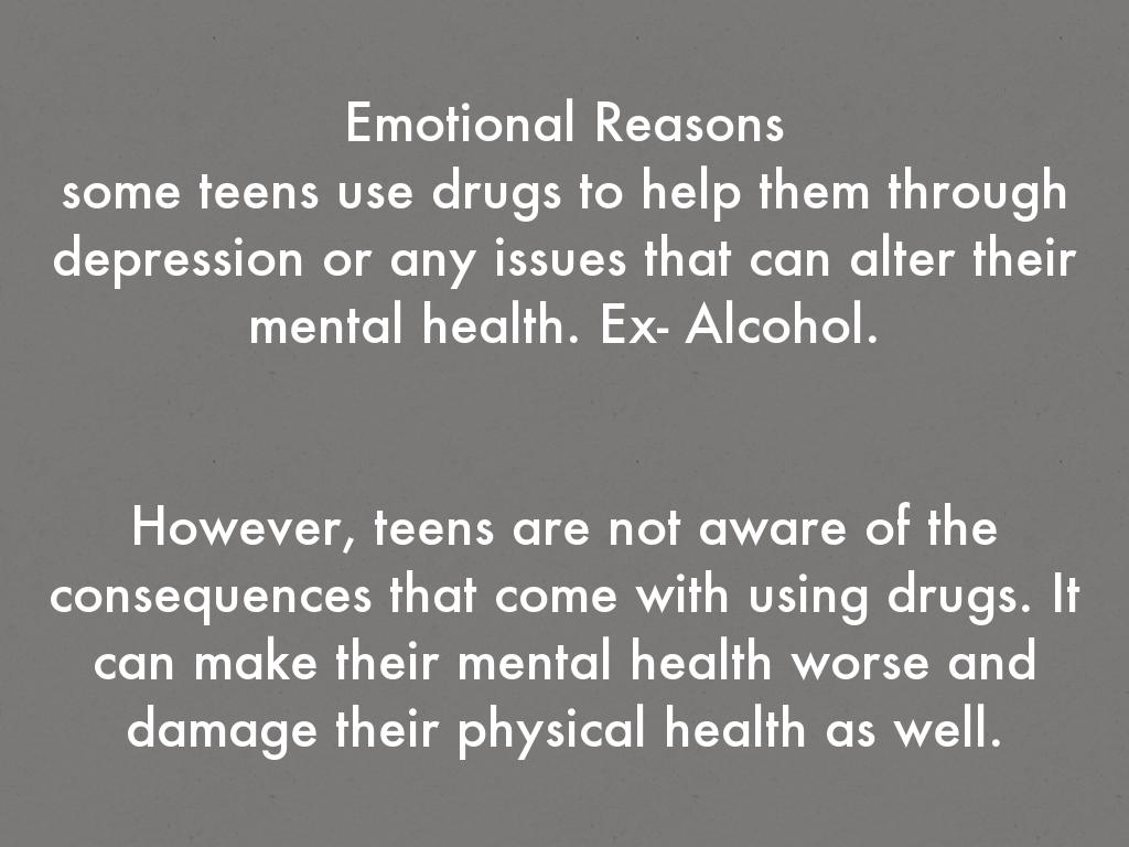 some teens use drugs to help them through depression or any issues that can alter their mental health. Ex- Alcohol.