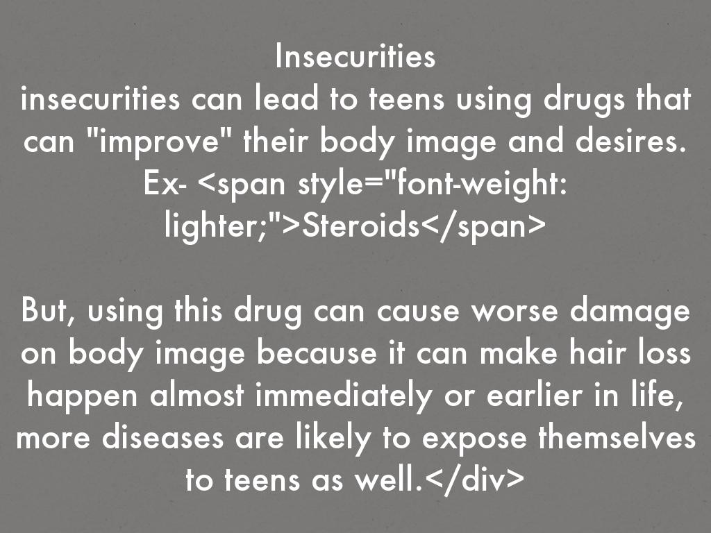 insecurities can lead to teens using drugs that can "improve" their body image and desires. Ex- Steroids