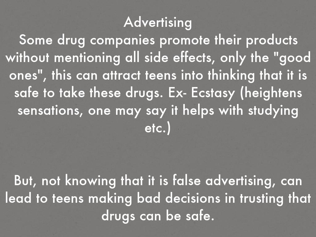 Some drug companies promote their products without mentioning all side effects, only the "good ones", this can attract teens into thinking that it is safe to take these drugs. Ex- Ecstasy (heightens sensations, one may say it helps with studying etc.)