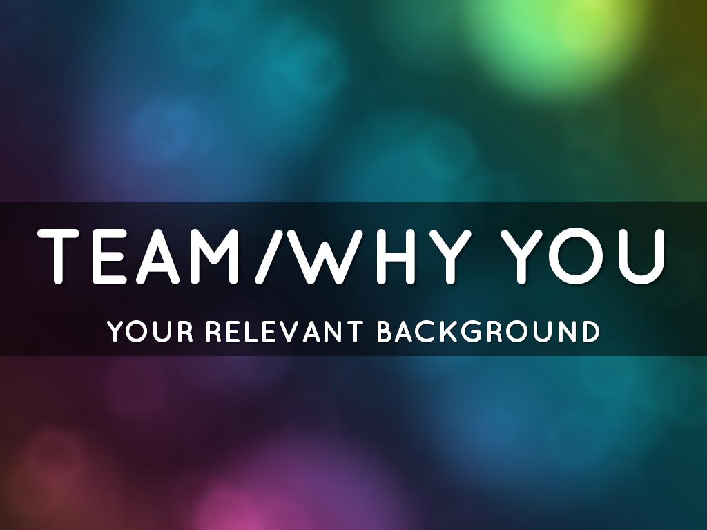 What have you done in the past that has prepared you to take on this new challenge? Why are you well-suited to succeed in this venture? How will others help you, and what relevant skills/experience will they bring to the project? How will you go about building your team from here and adding necessary expertise?