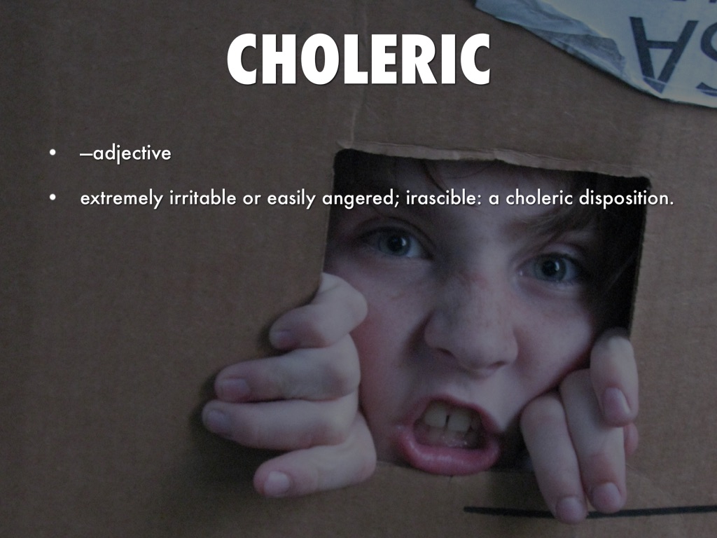 extremely irritable or easily angered; irascible: a choleric disposition.