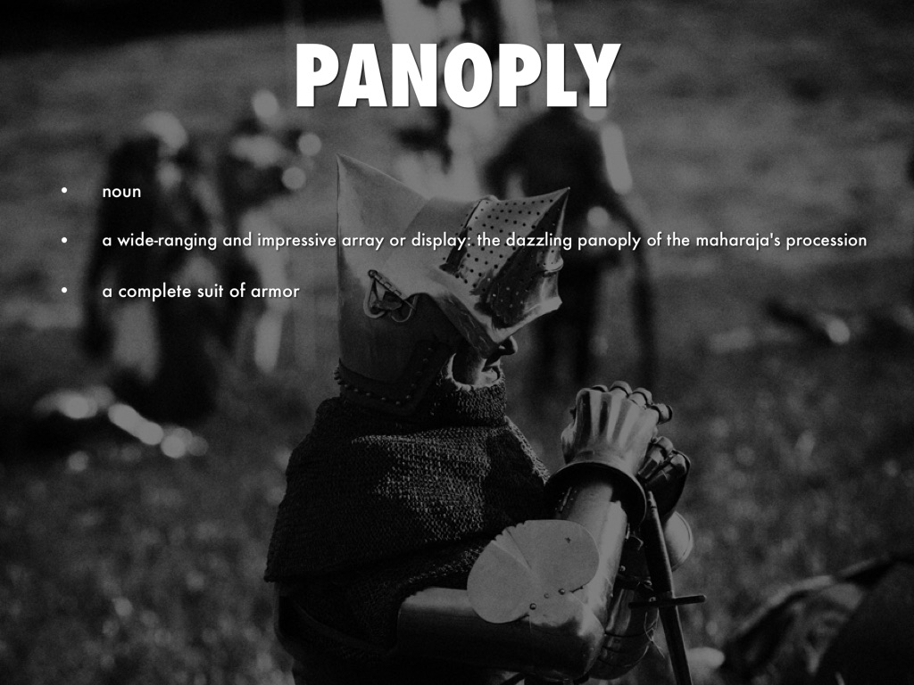 a wide-ranging and impressive array or display: the dazzling panoply of the maharaja's procession