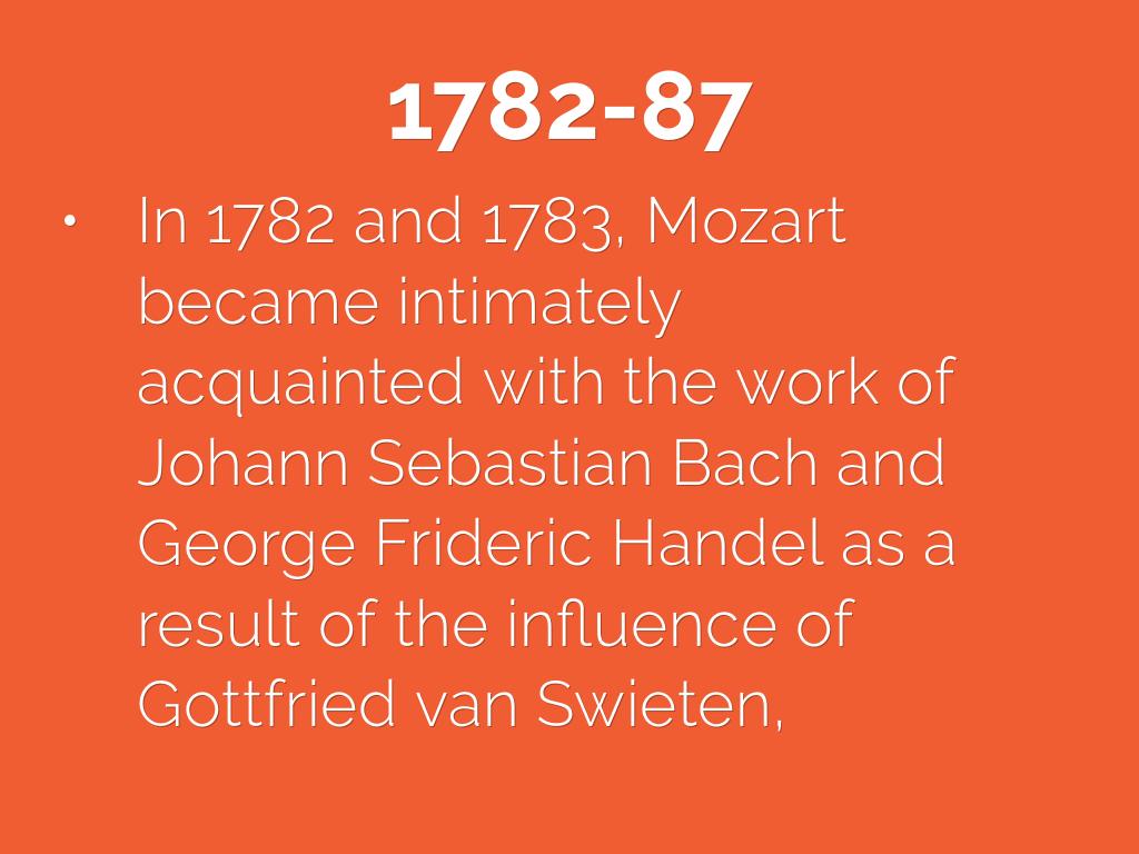 In 1782 and 1783, Mozart became intimately acquainted with the work of Johann Sebastian Bach and George Frideric Handel as a result of the influence of Gottfried van Swieten,