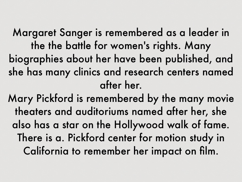 Margaret Sanger is remembered as a leader in the the battle for women's rights. Many biographies about her have been published, and she has many clinics and research centers named after her.