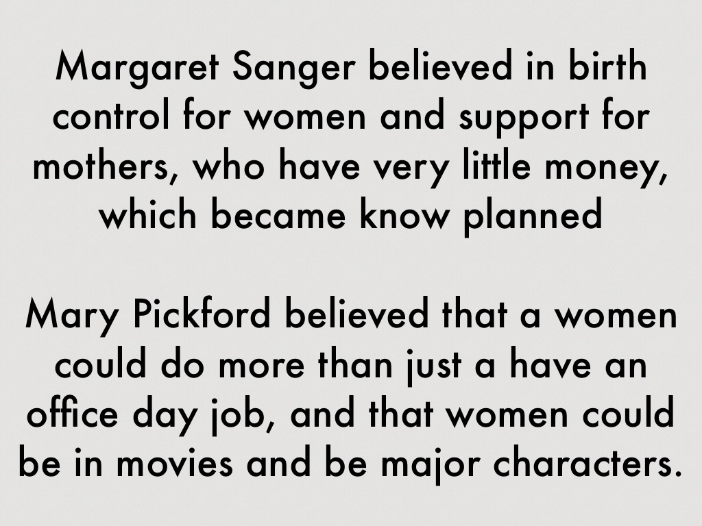 Margaret Sanger believed in birth control for women and support for mothers, who have very little money, which became know planned