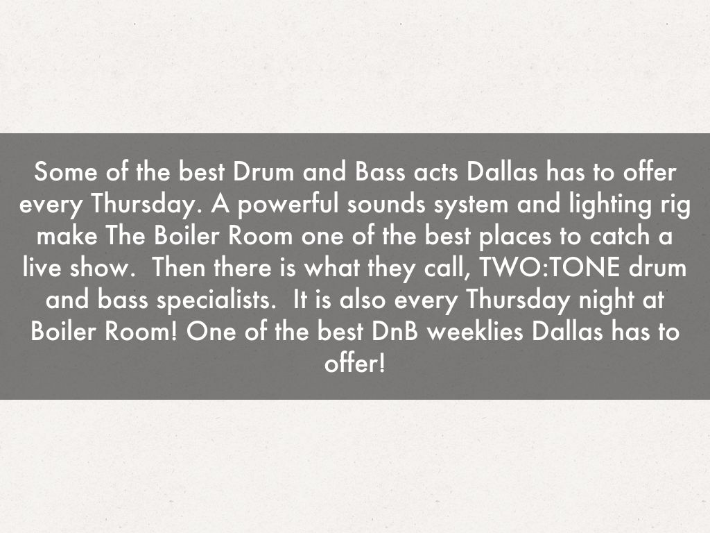 Some of the best Drum and Bass acts Dallas has to offer every Thursday. A powerful sounds system and lighting rig make The Boiler Room one of the best places to catch a live show. Then there is what they call, TWO:TONE drum and bass specialists. It is also every Thursday night at Boiler Room! One of the best DnB weeklies Dallas has to offer!