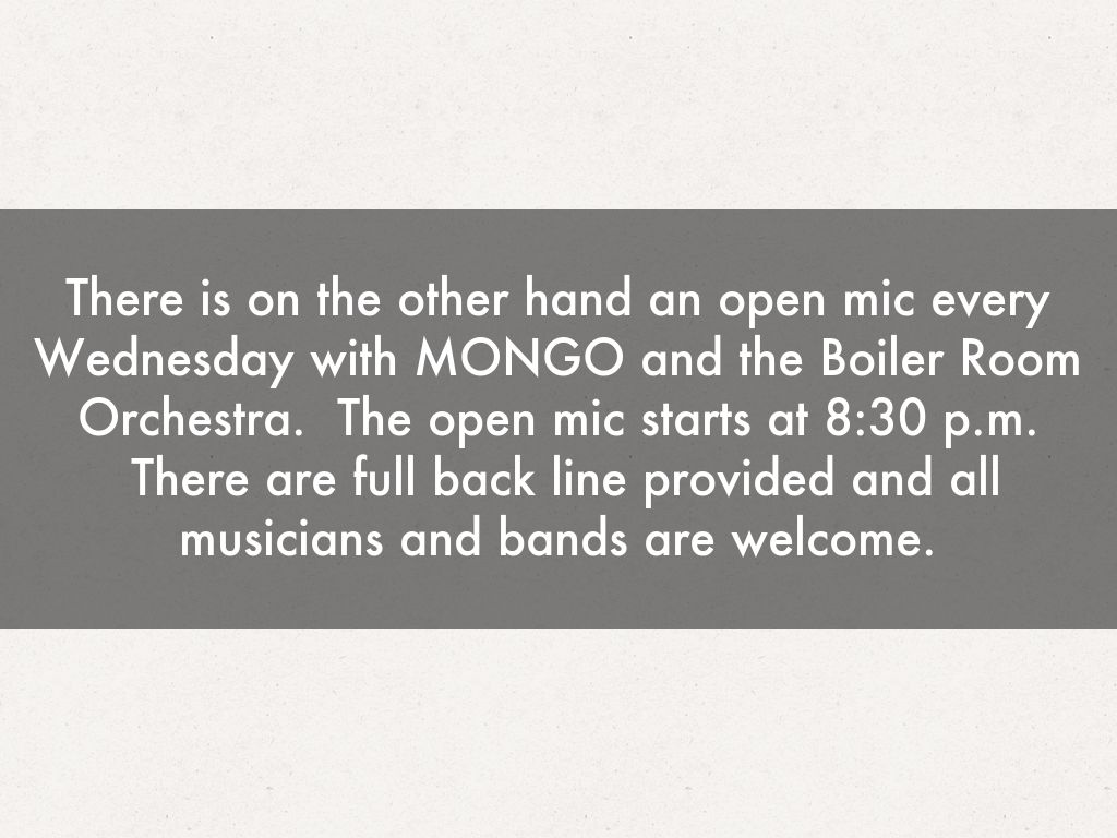 There is on the other hand an open mic every Wednesday with MONGO and the Boiler Room Orchestra. The open mic starts at 8:30 p.m. There are full back line provided and all musicians and bands are welcome.