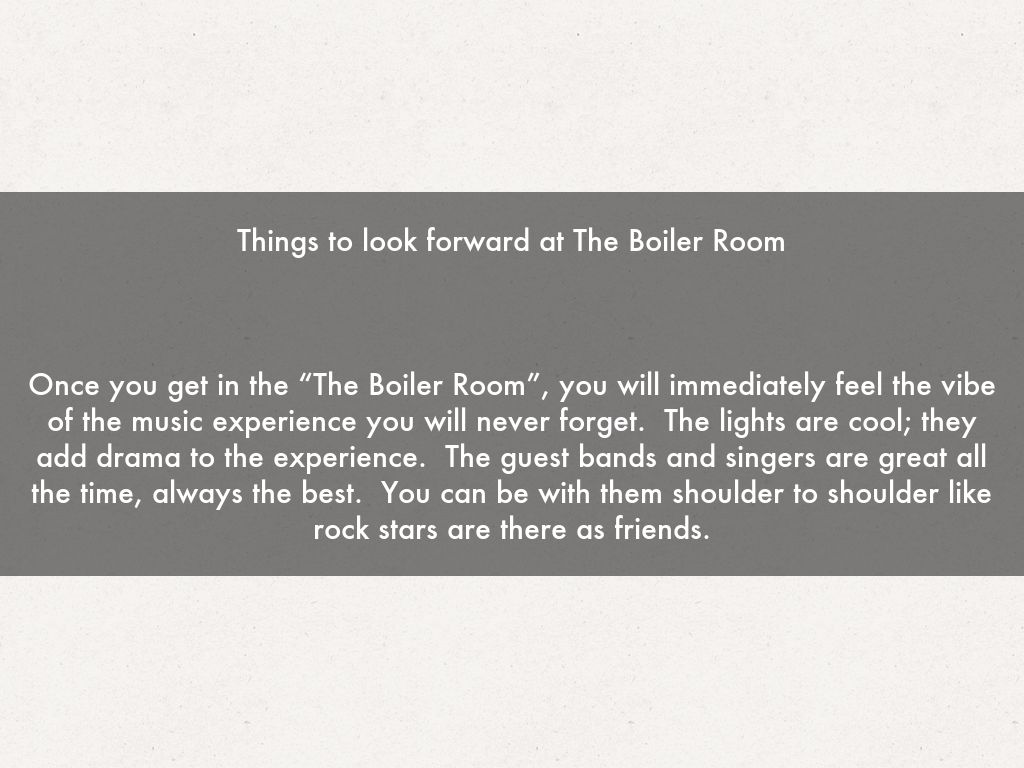 Once you get in the “The Boiler Room”, you will immediately feel the vibe of the music experience you will never forget. The lights are cool; they add drama to the experience. The guest bands and singers are great all the time, always the best. You can be with them shoulder to shoulder like rock stars are there as friends.
