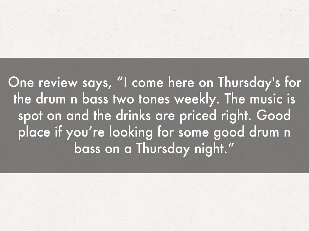 One review says, “I come here on Thursday's for the drum n bass two tones weekly. The music is spot on and the drinks are priced right. Good place if you’re looking for some good drum n bass on a Thursday night.”