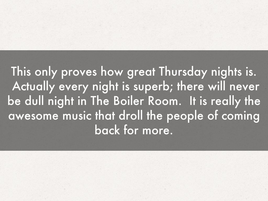 This only proves how great Thursday nights is. Actually every night is superb; there will never be dull night in The Boiler Room. It is really the awesome music that droll the people of coming back for more.