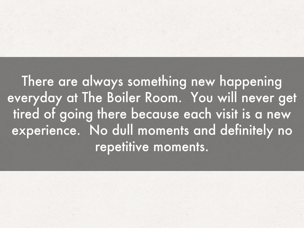 There are always something new happening everyday at The Boiler Room. You will never get tired of going there because each visit is a new experience. No dull moments and definitely no repetitive moments.