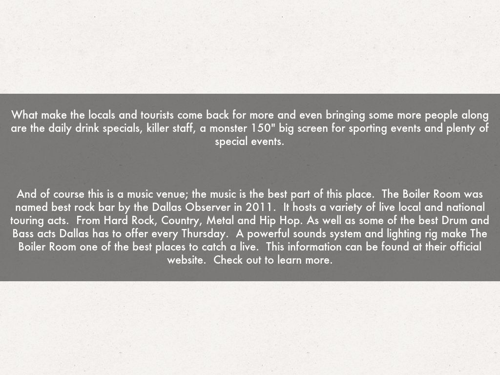 And of course this is a music venue; the music is the best part of this place. The Boiler Room was named best rock bar by the Dallas Observer in 2011. It hosts a variety of live local and national touring acts. From Hard Rock, Country, Metal and Hip Hop. As well as some of the best Drum and Bass acts Dallas has to offer every Thursday. A powerful sounds system and lighting rig make The Boiler Room one of the best places to catch a live. This information can be found at their official website. Check out to learn more.