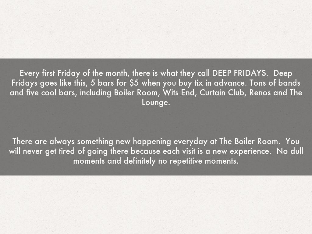 Every first Friday of the month, there is what they call DEEP FRIDAYS. Deep Fridays goes like this, 5 bars for $5 when you buy tix in advance. Tons of bands and five cool bars, including Boiler Room, Wits End, Curtain Club, Renos and The Lounge.