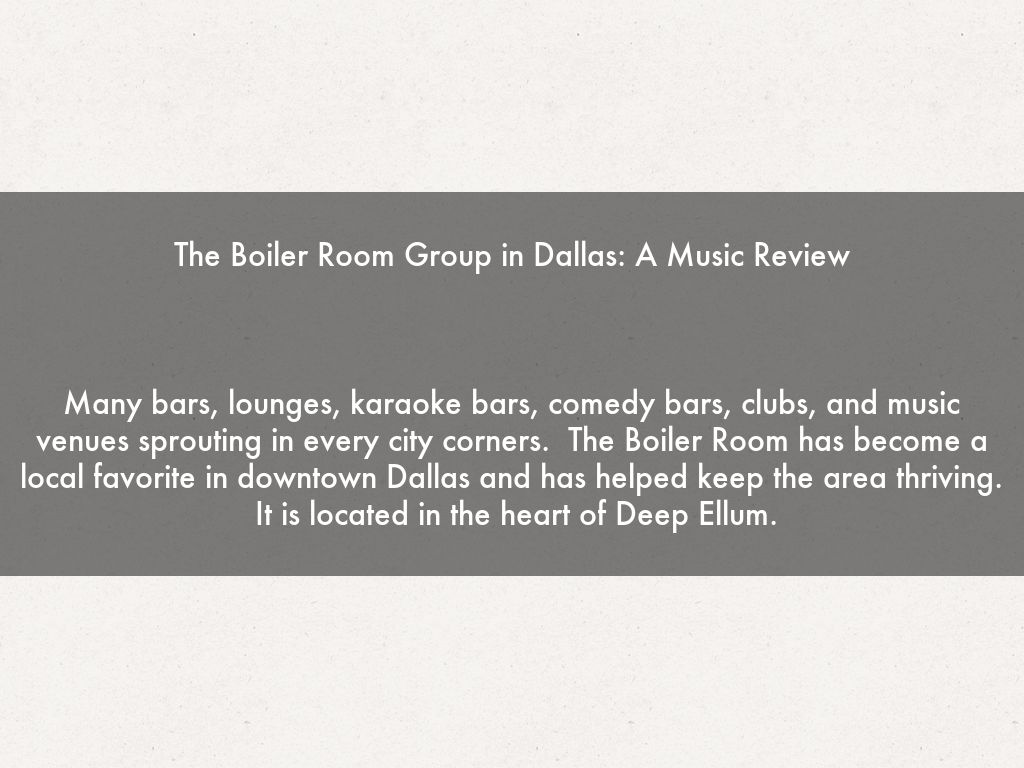 Many bars, lounges, karaoke bars, comedy bars, clubs, and music venues sprouting in every city corners. The Boiler Room has become a local favorite in downtown Dallas and has helped keep the area thriving. It is located in the heart of Deep Ellum.