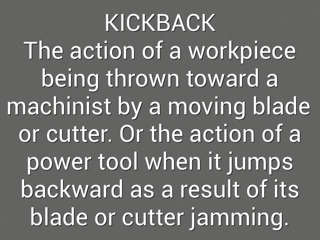The action of a workpiece being thrown toward a machinist by a moving blade or cutter. Or the action of a power tool when it jumps backward as a result of its blade or cutter jamming.
