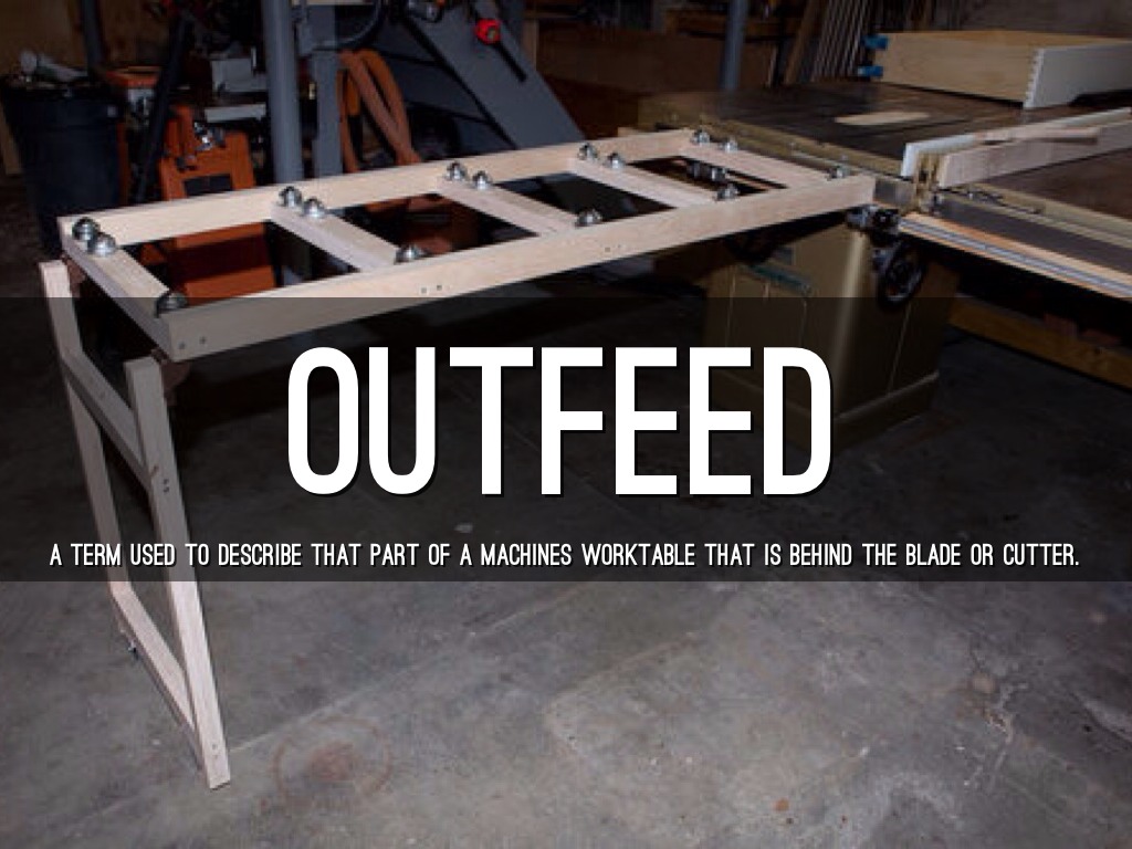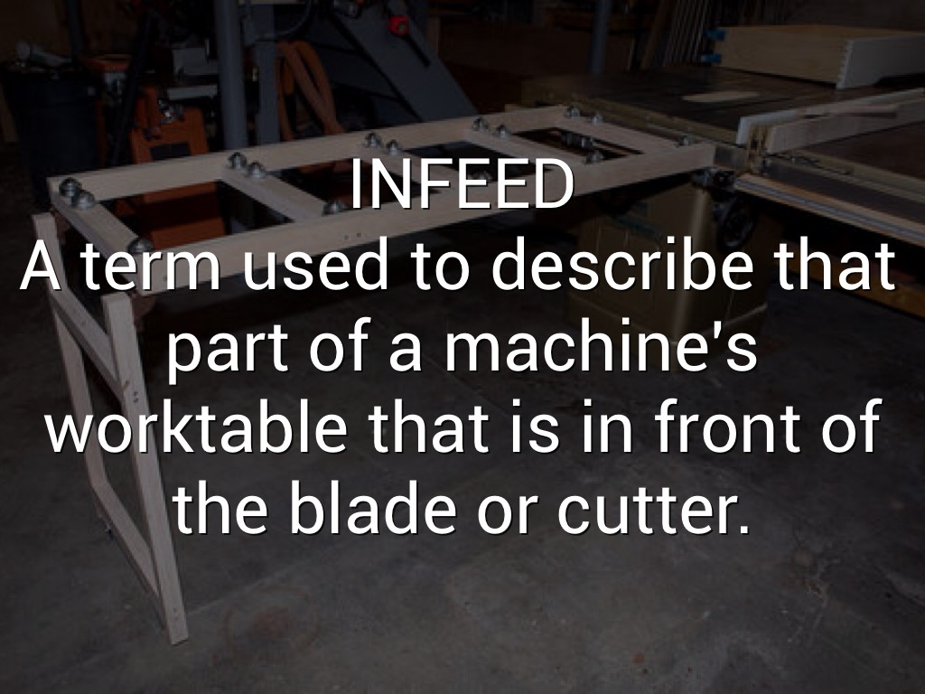 A term used to describe that part of a machine's worktable that is in front of the blade or cutter.