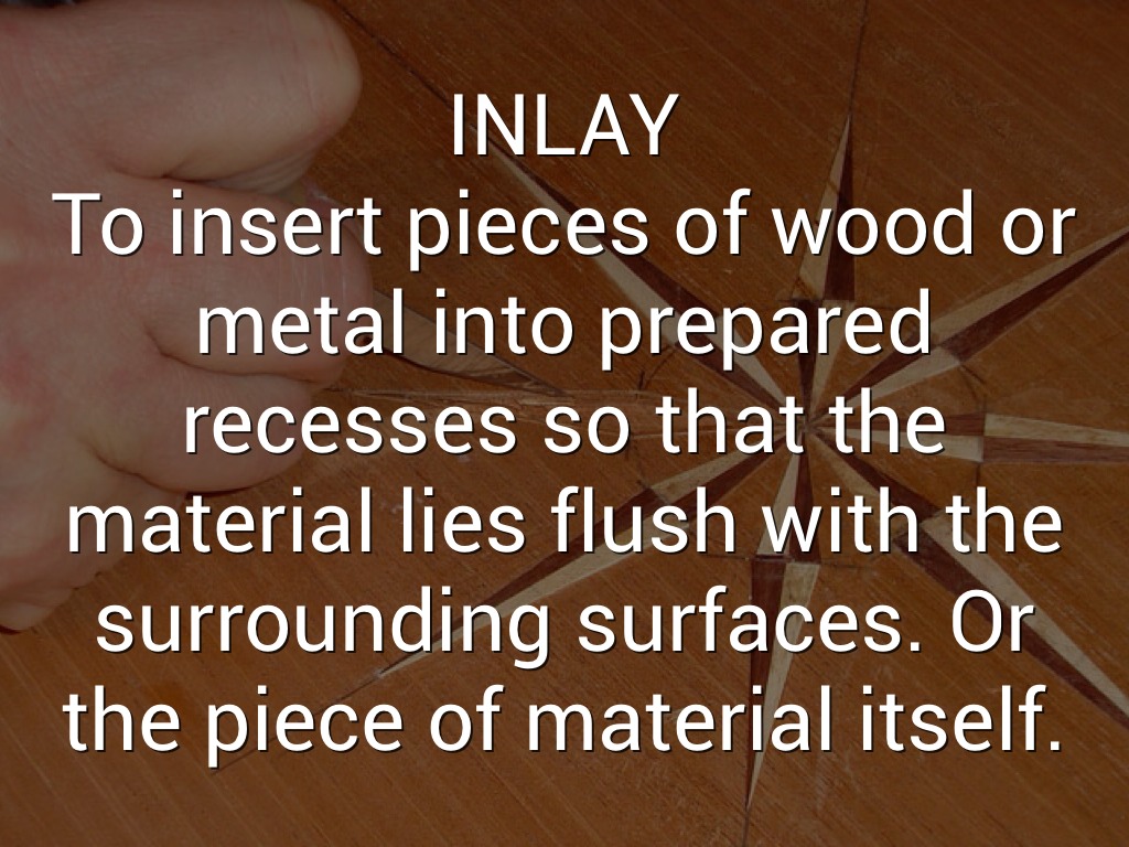 To insert pieces of wood or metal into prepared recesses so that the material lies flush with the surrounding surfaces. Or the piece of material itself.
