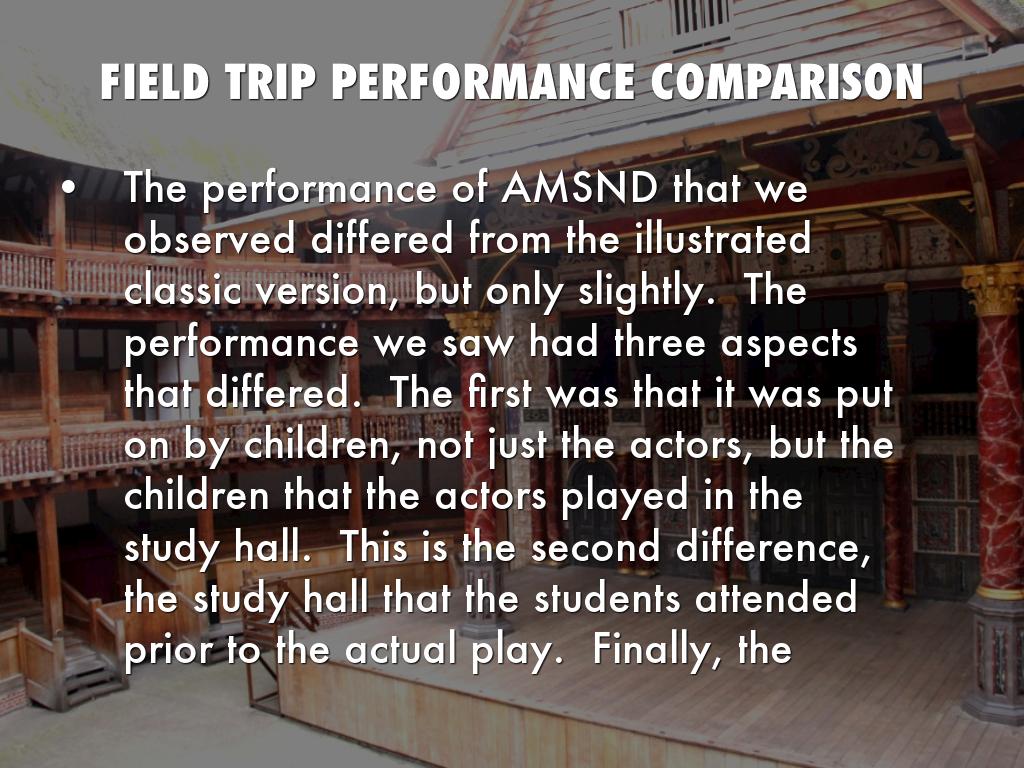 The performance of AMSND that we observed differed from the illustrated classic version, but only slightly. The performance we saw had three aspects that differed. The first was that it was put on by children, not just the actors, but the children that the actors played in the study hall. This is the second difference, the study hall that the students attended prior to the actual play. Finally, the narrators that helped to better explain AMSND as the language was the original language from Shakespeare's play. Otherwise, the play was very similar to the classic version. The characters and lines were similar, if not the same, with the exception of the lines added for the narrators.