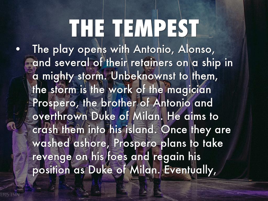 The play opens with Antonio, Alonso, and several of their retainers on a ship in a mighty storm. Unbeknownst to them, the storm is the work of the magician Prospero, the brother of Antonio and overthrown Duke of Milan. He aims to crash them into his island. Once they are washed ashore, Prospero plans to take revenge on his foes and regain his position as Duke of Milan. Eventually, through magic, intimidation, and trickery, Prospero succeeds in his plans. Prospero is restored to his reign and brings about the revelation of Antonio's betrayal. Then he secured the marriage of Miranda to King Alonso's son, Prince Ferdinand. This seems to contrast with Egeus in A Midsummer Night’s Dream, as Prospero, Miranda’s father, respects her wishes and love towards Prince Ferdinand. Eventually, however, his sly work paid off in the end as his plan succeeded, and both he and his daughter were happy.