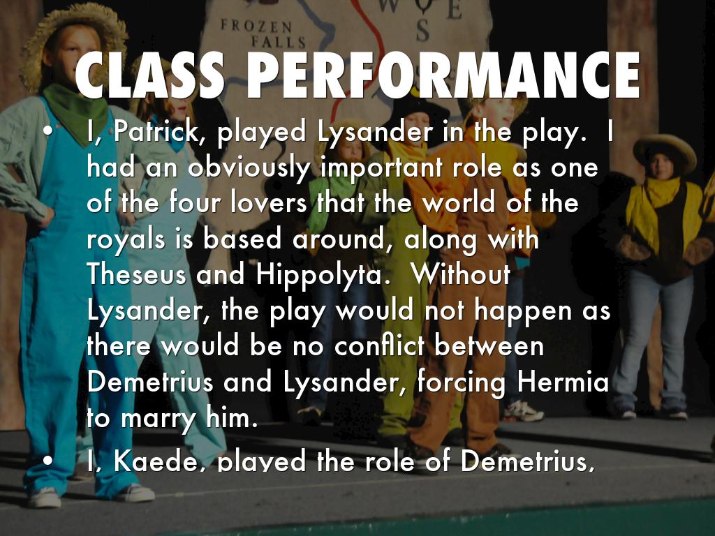 I, Patrick, played Lysander in the play. I had an obviously important role as one of the four lovers that the world of the royals is based around, along with Theseus and Hippolyta. Without Lysander, the play would not happen as there would be no conflict between Demetrius and Lysander, forcing Hermia to marry him.