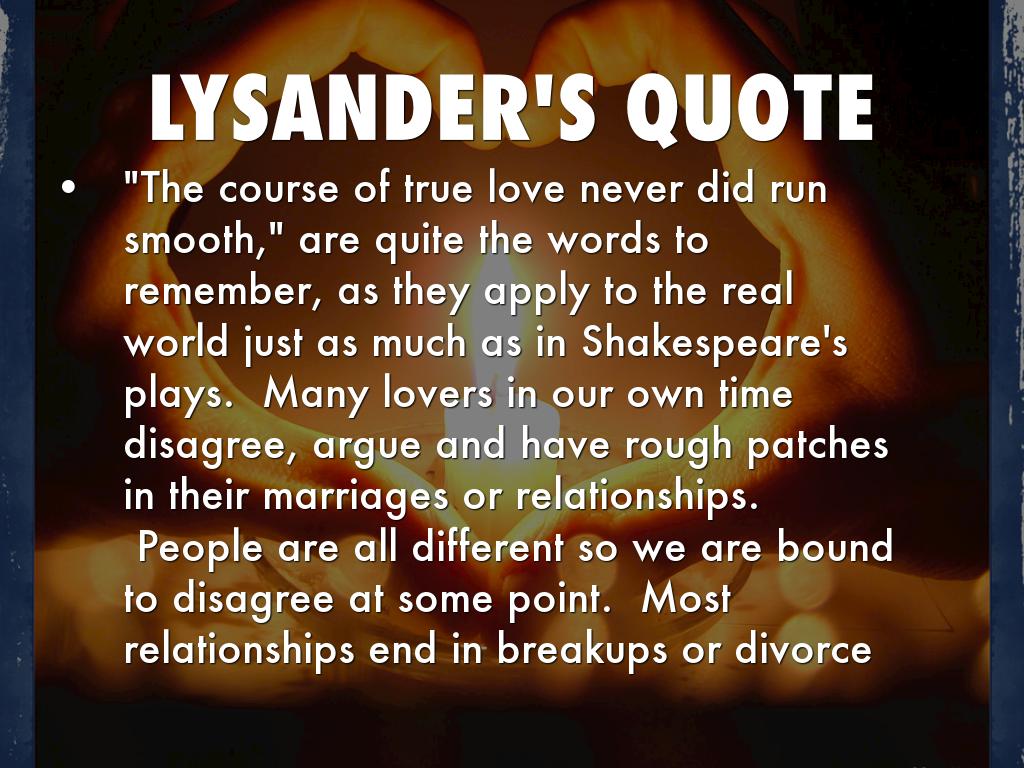 "The course of true love never did run smooth," are quite the words to remember, as they apply to the real world just as much as in Shakespeare's plays. Many lovers in our own time disagree, argue and have rough patches in their marriages or relationships. People are all different so we are bound to disagree at some point. Most relationships end in breakups or divorce based on the levels of disagreement. When it comes to true love, however, we can take these differences to make our bond or relationship stronger. In the case of Lysander and Hermia they truly love each other but outside forces disrupt their relationship. This can also occur in the real world as it can be a dark, grim place. In conclusion, love can have disruptions, but true love always prevails.