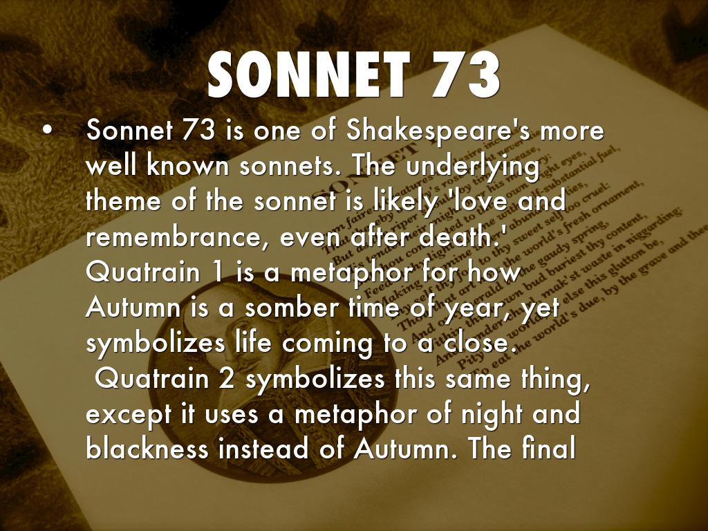 Sonnet 73 is one of Shakespeare's more well known sonnets. The underlying theme of the sonnet is likely 'love and remembrance, even after death.' Quatrain 1 is a metaphor for how Autumn is a somber time of year, yet symbolizes life coming to a close. Quatrain 2 symbolizes this same thing, except it uses a metaphor of night and blackness instead of Autumn. The final quatrain symbolizes how the light of his life, Shakespeare's or that whom he is writing to, is going out. The couplet describes how even after death, love continues to grow and never fades. In conclusion, Sonnet 73 is a poem about loving someone after they have passed away, and continuing to keep the flame of their memory burning strong in our hearts.