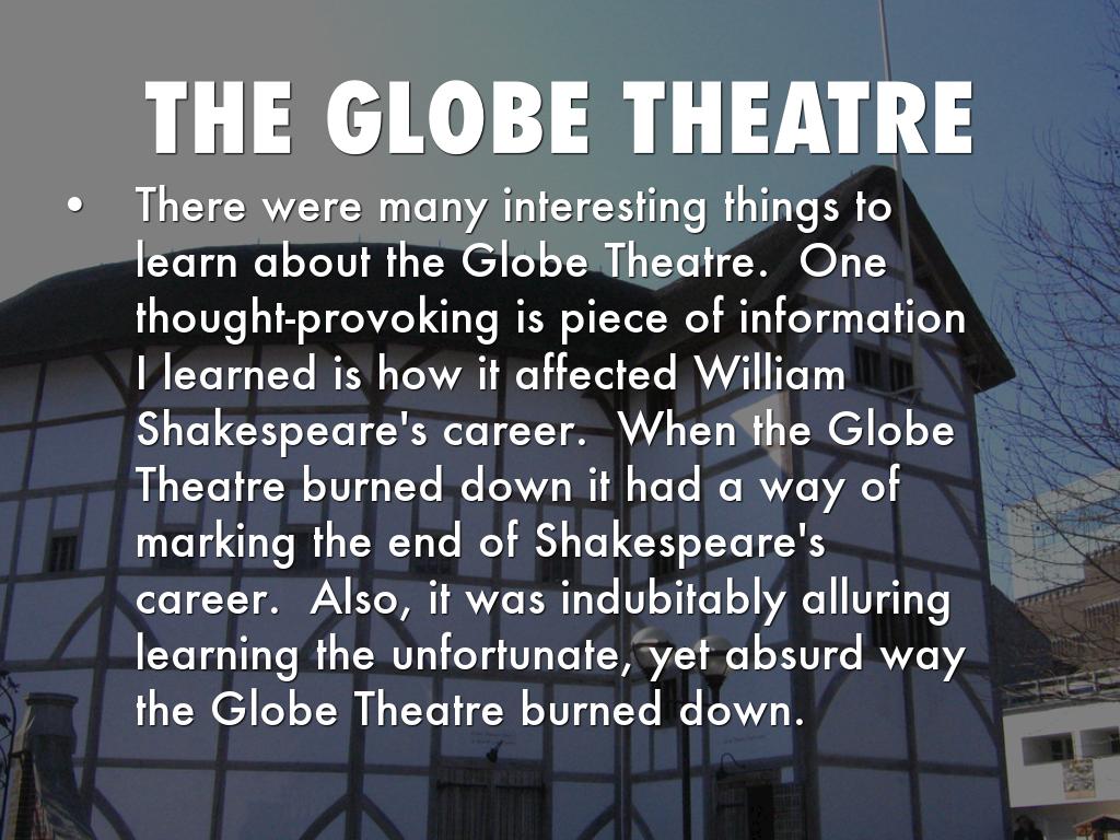 There were many interesting things to learn about the Globe Theatre. One thought-provoking is piece of information I learned is how it affected William Shakespeare's career. When the Globe Theatre burned down it had a way of marking the end of Shakespeare's career. Also, it was indubitably alluring learning the unfortunate, yet absurd way the Globe Theatre burned down. Learning how the cannon misfired and burned the theatre down made me think how the operator of the cannon may have been rather clumsy or a troublesome child. One last interesting thing I gained the knowledge about the Globe Theatre is how they had to move it. It made me think how dedicated Shakespeare must have been to his work to move an entire theatre across a river into the bad side of town just so he could keep his theatre open.